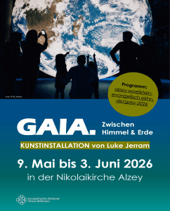 Das Evangelische Dekanat Alzey-Wöllstein zeigt von 9. Mai bis 3. Juni 2026 Luke Jerrams Kunstwerk „Gaia“ in der Alzeyer Nikolaikirche. Ein Erdball mit 6 Metern Durchmesser schwebt im Kirchenschiff und ermöglicht Ihnen einen einmaligen Blick auf den blauen Planeten. Die besondere Perspektive auf unsere Erde hat man sonst nur aus dem Weltall, z.B. als Astronaut auf der ISS. Die Kunstinstallation möchte auf die Verbindung allen Lebens auf der Erde aufmerksam machen. Zugleich regt sie zu einem nachhaltigen und ressourcenschonenden Umgang mit unserem Planeten an. Wer „Gaia“ schon einmal live gesehen hat, berichtet von einem ehrfürchtigen Gefühl. Erleben Sie selbst, was der Anblick mit Ihnen macht! Das Begleitprogramm veröffentlichen wir rechtzeitig vorab. Weitere Infos folgen...