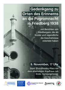 Start: Elvis-Presley-Platz Friedberg vor dem ehemaligen Kaufhaus Joh, Ende am Synagogenplatz Mit Berichten von Friedbergern, die als Kinder und Jugendliche die Geschehnisse miterlebt haben.