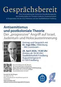 „Gesprächsbereit“ – Eine Veranstaltungsreihe des Deutschen Koordinierungsrates der Gesellschaften für Christlich-Jüdische Zusammenarbeit (DKR) Vortrag und Gespräch mit Dr. Ingo Elbe, Oldenburg Einlass ab 18:30 Uhr Die Postcolonial Studies sind im akademischen und kulturellen Bereich inzwischen vielfach tonangebend. Sie werden von dem Gedanken geleitet, dass sich koloniale Spuren im Wissenssystem und in den sozialen Strukturen von Gesellschaften auch nach dem Ende der formalen Kolonialherrschaft finden. Sie beanspruchen zudem, mit dem Prinzip der „Kolonialität“ einen Schlüssel zum Verständnis von Judentum, Zionismus und Schoa gefunden zu haben. An dem Abend wird der ausgewiesene Experte Dr. Ingo Elbe über die theoretischen Verzerrungen aufklären, die dadurch entstehen. Dazu gehören die begriffliche Auflösung des Antisemitismus in Rassismus, die Relativierung des Holocaust zum Kolonialverbrechen, die Dämonisierung Israels und die Ausblendung des islamischen und arabischen Antisemitismus. Zudem werden in Vortrag und Gespräch auch die politischen Konsequenzen dieses Diskurses thematisiert, die seit dem Massaker der Hamas vom 7. Oktober 2023 weltweit die Gestalt einer beispiellosen Welle des ‚progressiven‘ Hasses auf Israel annehmen. Dabei wird der Frage nachgegangen, wie es möglich wurde, dass an westlichen Elite-Universitäten inzwischen angesehene Intellektuelle das Massaker der Hamas als Befreiungsakt feiern und Student:innen offen zum Mord an Zionist:innen aufrufen. Dr. Ingo Elbe ist wissenschaftlicher Mitarbeiter und Privatdozent am Institut für Philosophie der Carl von Ossietzky Universität Oldenburg. Letzte Publikationen u. a.: Probleme des Antirassismus.“ Postkoloniale Studien, Critical Whiteness und Intersektionalitätsforschung in der Kritik, Berlin 2022 (als Mitherausgeber); Hannah Arendts Bild des Holocaust – mit einem Ausblick auf seine postkolonialen Erben, in: A. Stahl/M. Seul u.a. (Hg.): Erinnern als höchste Form des Vergessens. (Um-) Deutungen des Holocaust und der Historikerstreit 2.0, Berlin 2023; „By Any Means Necessary“ – Authoritarianism and the Potential for Violence in Anti-Zionist Postcolonial Discourse, in: Israel Journal of Foreign Affairs, July 2025. Livestream: https://www.youtube.com/@DeutscherKoordinierungsratGCJZ/streams Eine Anmeldung für den Besuch der Veranstaltung vor Ort ist erforderlich: https://doo.net/veranstaltung/214594/buchung Bitte führen Sie ein gültiges Ausweisdokument mit sich.