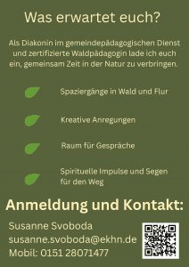 Herzliche Einladung zu gemeinsamer Zeit in der Natur. - Spaziergänge in Wald und Flur - Kreative Anregungen - Raum für Gespräche - Spirituelle Impulse und Segen für den Weg
